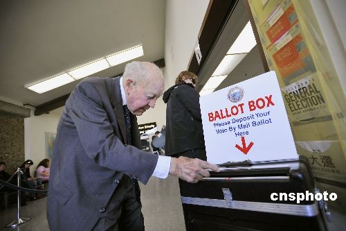 当地时间十一月四日,美国总统选举投票日,加州民众参与热情高涨,九十九岁高龄的老翁马里奥步行到投票站投票。中新社发 陈钢 摄