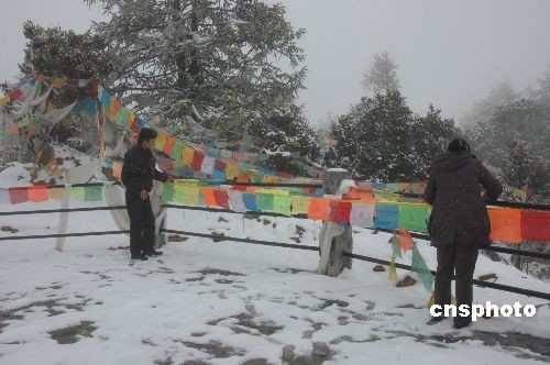 深秋季节,四川甘孜藏族自治州高海拔地区普降大雪。图为被誉为“中国最后的香格里拉”——四川稻城县内,当地藏民正在雪地中挂龙达祈祷吉祥。中新社发 肖龙联 摄