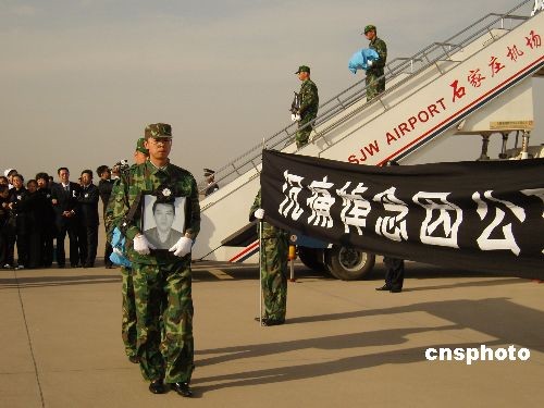 图为工作人员护送5名遇难中国工人的遗像和骨灰走下飞机。
