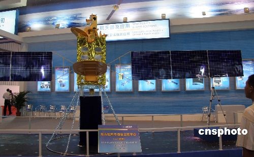 图为中国航天科技集团公司研制的新一代通信卫星研制平台“东方红四号”模型在航展上展出。中新社发 孙自法 摄