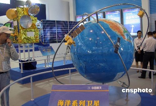 图为中国航天科技集团公司研制的海洋系列卫星在珠海航展展出,左上为海洋二号卫星模型。中新社发 孙自法 摄