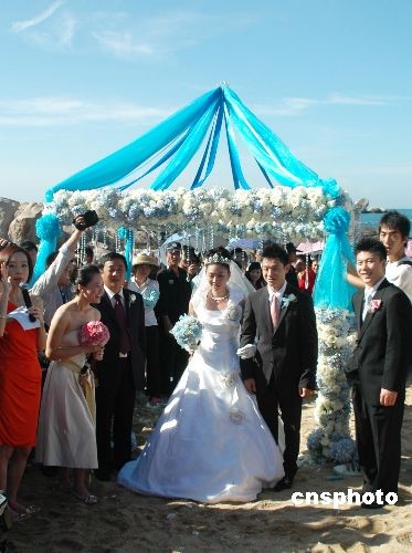 11月6日,2008北京奥运会体操“全能王”在海南三亚著名的天涯海角景区的爱情广场的沙滩上举行盛大浪漫的婚礼,与新娘杨云经过8年的爱情长跑,终于走进婚姻的殿堂。杨威和新娘杨云登上热气球,演绎空中浪漫。中新社发 尹海明 摄