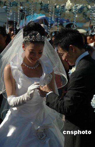 图为婚礼现场杨云为杨威佩戴新婚戒指。中新社发 尹海明 摄