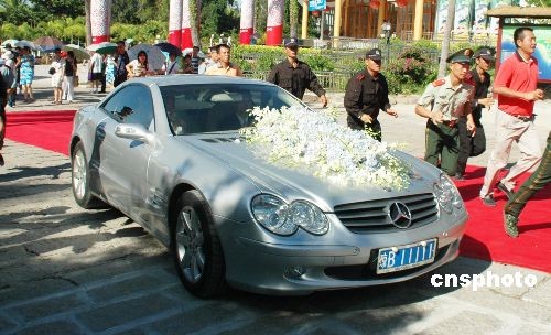 11月6日,2008北京奥运会体操“全能王”在海南三亚著名的天涯海角景区的沙滩上举行盛大浪漫的婚礼,与新娘杨云经过8年的爱情长跑,终于走进婚姻的殿堂。图为杨威迎娶杨云的豪华婚车。中新社发 尹海明 摄