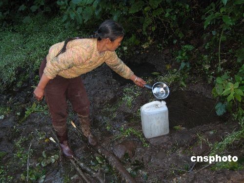 11月2日凌晨,云南楚雄发生泥石流灾害。受灾最为严重的楚雄市西舍路乡新华村大路边小组的320名村民临时转移至距灾害现场两公里的大光山上,但因交通中断,救援物资很难运进灾区,民众只能到附近的山谷的小水潭中打水。图为一位灾民到山谷中打水,以解决暂时吃水困难问题。