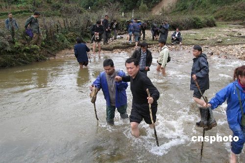 11月2日,云南楚雄发生泥石流灾害,多条进入灾区的道路塌方中断。楚雄州市官员徒步17个小时进入灾区一线,指挥救援工作。图为楚雄市市长袁鹏(图正中者)赤脚淌水过河,步行7个半小时从灾区返城布置下一步的救援工作安排。他表示,随着道路抢修里程增加,大量的救援物资将陆续运入灾区,保证不让一位灾民在寒冷中过冬。