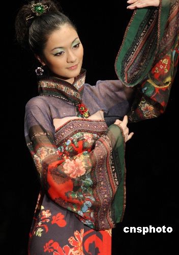 11月9日晚,在北京举行的中国国际时装周2009春夏系列发布上,推出邓皓“似水女人”时装作品。服装设计上充分利用针织与梭织面料的特性进行组合搭配,同时以大量的刺绣、镶花、缕空、辑线在服饰上的运用,体现出女性柔情似水,更表达出一种自信的人文关怀。中新社发 钱兴强 摄