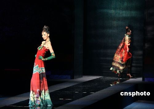2008年11月9日,中国国际时装周(2009春夏系列)在北京举行邓皓2009春夏时装发布,莫万丹、刘多两大名模倾情演绎,台上相互争艳。中新社发 鲁谷 摄