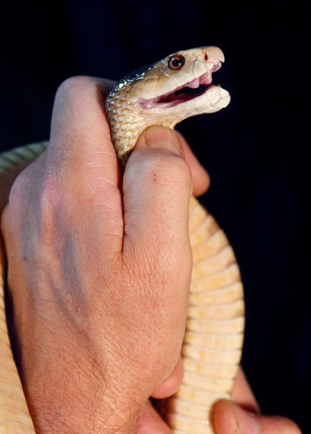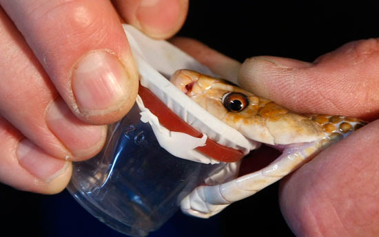蛇工雷蒙德提取一条海岸太攀蛇的毒液