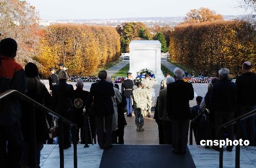 每年11月11日是美国的老兵节,美国政府都会在位于华盛顿特区一河之隔的弗吉尼亚阿灵顿国家公墓进行纪念活动,这里埋葬着5万多名为国捐躯的美国将士。当日,美国副总统切尼出席了在这里举行的纪念仪式。中新社发 邱江波 摄