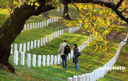 图为一对市民在阿灵顿国家公墓凭吊埋葬在这里的亲友。中新社发 邱江波 摄