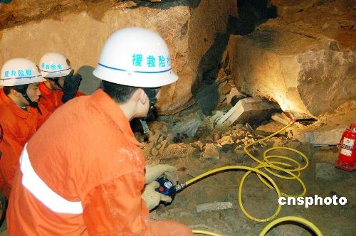 11月11日,重庆市武隆县庙垭乡中心小学在建食堂工地发生塌方事故,目前已造成3人死亡,1人重伤。图为当地消防官兵当日晚使用起重气垫顶开巨石搜救被埋人员。中新社发 蒋勇 摄