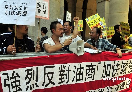 十一月十二日,香港立法会动议辩论,要求政府加强监管油公司价格。有团体的代表,在立法会外请愿。中新社发 谭达明 摄