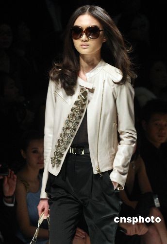 11月13日晚,意大利某著名时装品牌在北京举行中国的首场时装发布会。图为模特展示新款时装。新社发 钱兴强 摄