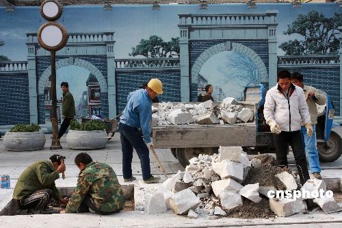 11月14日, 北京前门大街南段,长50米、宽10余米的路段用警戒线围了起来,施工人员正在对路面及其它设施进行维修保养。届时,备受关注的前门大街“铛铛车”也已清洗一新,即将载客运行,那“铛铛”的声音时隔42年后将再次回到前门大街。8月7日开街以来,前门大街已接待1000多万的游客,这是开街3个多月来第一次路面保养。中新社发 郑雄增 摄