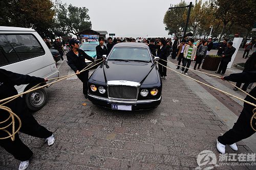 17日,杭州,20多人拉着一辆价值500多万的高档豪华轿车,在西湖边向路人展示这辆豪华轿车的名不副实。