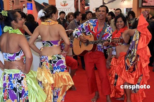 非洲诸多国家看好中国公民旅游潜力,在上海“二00八中国国际旅游交易会”上,载歌载舞推介旅游资源。新社发 潘索菲 摄