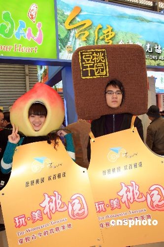 11月20日,台湾桃园在上海“二00八中国国际旅游交易会”上,推销特色名产“豆干”、“水蜜桃”,吸引上海人体验桃园县自然人文之美。中新社发 潘索菲 摄