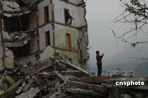 11月21日,一位摄影者站在北川老县城废墟上拍摄经受了“512”大地震、堰塞湖、泥石流三重灾难洗劫的北川。中新社发 肖龙联 摄