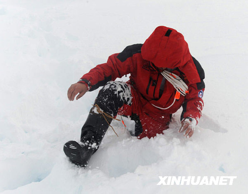 由于南极大陆周围多年未化的“老冰”和刚刚结成的“新冰”混合一起,堵死了“雪龙”号前进的航线,25日晚6时,“雪龙”号有关负责人决定由船上队员组成探冰队下船察看冰情。