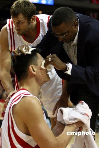 姚明眼角负伤血染球场 墨菲黑肘打破小巨人眉骨