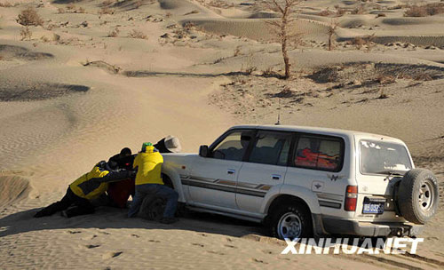 11月27日,科考队员将陷进沙漠中的越野车推出。新华社记者 张鸿墀 摄