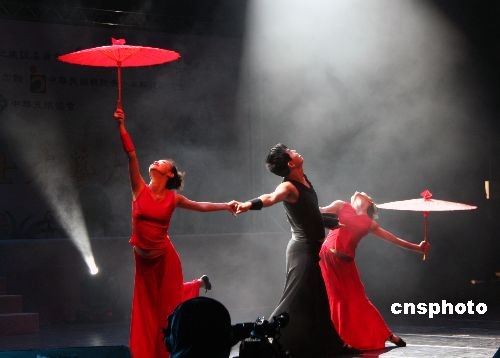 上海残疾人艺术团的聋人舞蹈演员在晚会上表演舞蹈《红黑伞》。中新社发 周兆军 摄