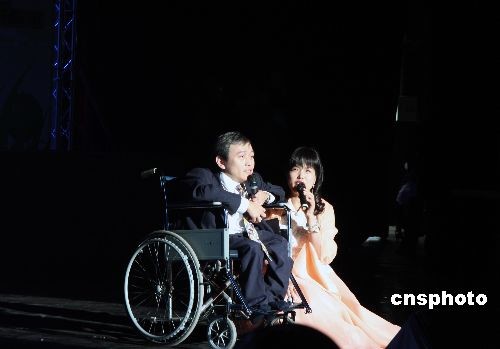 双腿残疾的刘铭(左)和双目失明的朱万花主持晚会。中新社发 周兆军 摄