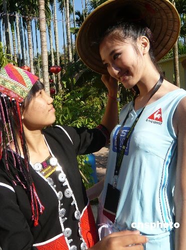 12月2日,正在海南三亚举行的2008新丝路中国模特大赛总决赛的参赛选手进行赛事活动,参赛的49名男女选手来到美丽的三亚槟榔河生态新村参观。图为黎族姑娘为参赛佳丽戴上斗笠。