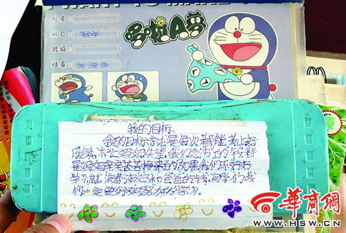 席海涛的文具盒上也有奋斗目标:“我的目标是每次都能考上好成绩,不让妈妈失望,我们念书的钱都是妈妈辛辛苦苦挣来的,如果我们不好好学习,就浪费了妈妈和爸爸的钱,同学们我们一定要好好努力的学习。”