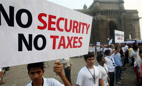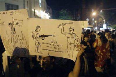 近万名孟买市民3日晚上聚集到泰姬玛哈酒店附近举行游行示威,抗议政府反恐不力。