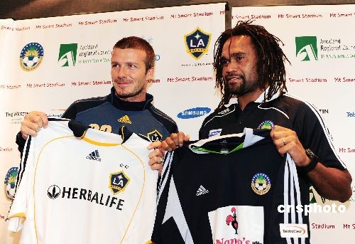新西兰时间12月4日上午10时,在奥克兰Westin酒店举行了“洛杉矶银河队奥克兰之旅”记者会。在记者会上,银河队与太平洋明星队代表交换了队服。 中新社发 胡旭君 摄