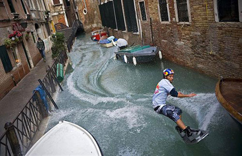 图:威尼斯洪水肆虐 年轻人大玩水上滑板