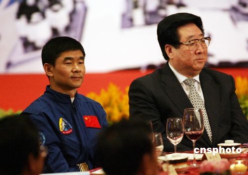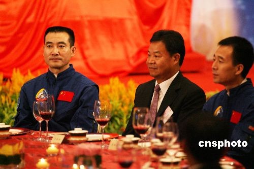 图为神舟七号航天员翟志刚、景海鹏等在宴会上。