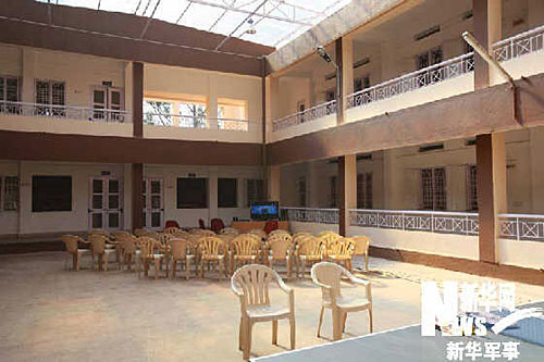 中方参训官兵的宿舍是棕灰色二层院落式楼房,中间有一个大天井,可以在这里集合或者进行一些简单的娱乐。
