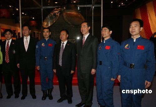图为香港政务司司长唐英年、神舟七号载人航天飞行赴港代表团团长暨中国载人航天工程副总指挥张建启、神七航天员翟志刚、刘伯明、景海鹏等在返回舱前合影。中新社发 武仲林 摄