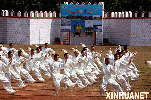 12月6日,“携手-2008”中印陆军反恐联合训练开训。开训仪式结束后,中印双方进行了武器装备展示和训练课目演示。中方参训部队进行了太极拳、捕俘技术、反恐应用射击动作的演示,印方参训分队演示了木杆操、印度传统武术等课目。参训双方官兵精神振奋,配合默契。