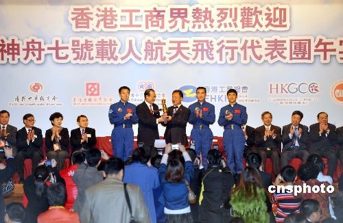 团长张建启及航天员翟志刚、刘伯明和景海鹏向工商界代表赠送“神舟七号”模型。中新社发 邓庆乐 摄