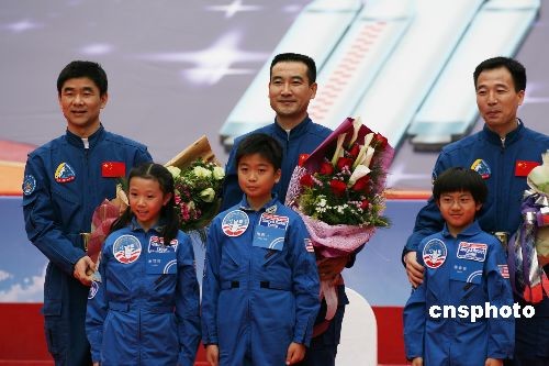 图为三位航天员隆重出场。中新社发 武仲林 摄
