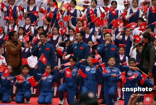 “神舟七号” 航天员翟志刚、刘伯明和景海鹏与香港艺人谭咏麟、李克勤合唱《龙的传人》。中新社发 武仲林 摄