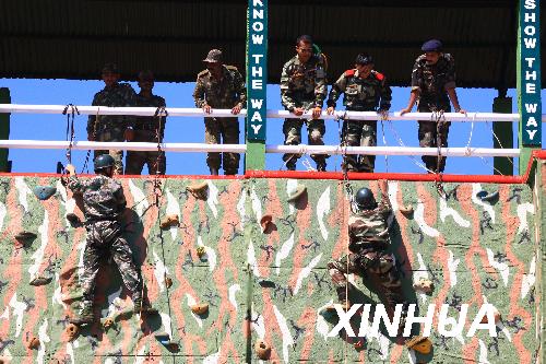 中印双方参训人员在印度贝尔高姆地区进行攀岩训练。新华社记者李刚摄