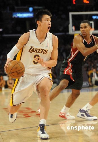 当地时间十二月七日晚,NBA洛杉矶湖人队在主场以一百零五比九十二轻取雄鹿队,中国球员孙悦首度在NBA常规赛上登场,共取得四分。在终场前五分十三秒,孙悦上场,每当他拿球,整个斯坦普斯体育场内欢声雷动。中新社发 张炜 摄