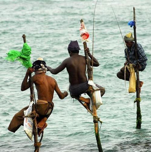 这是在斯里兰卡南部的海岸线上,近Koggala的小镇上,在傍晚四五点时,会有渔夫站立在立竿上钓鱼,真的是很特别的景观。这个奇特的钓鱼姿势,可不是一时半会儿就能学会的。