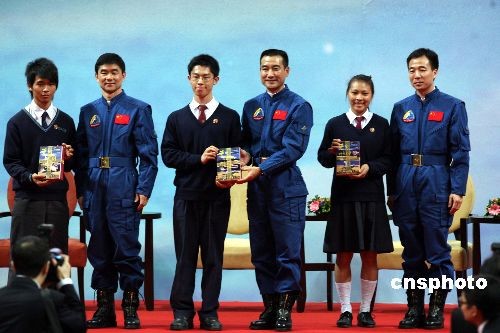 十二月九日,“神舟七号”载人航天飞行代表团一行在澳门理工学院与澳门学生真情对话,分享太空之旅的经过和感想。