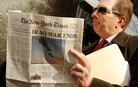 纽约一名读者正在阅读一份假的《纽约时报》,报纸的头版头条竟然是伊拉克战争结束。尽管报头、字体、字型都达到了以假乱真的程度,但它仍然是“赝品”,这份由专门戏弄名人和名组织机构的“应声虫”组织伪造的《纽约时报》上标明的发行日期是2009年7月4日,据称,他们是希望通过此举达到鞭策新当选总统奥巴马恪守承诺的目的。