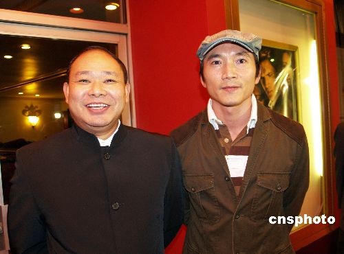 图为左起张伦导演与好莱坞武打明星邹兆龙在首映式上。中新社发 卢威 摄