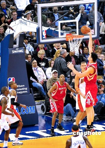 当地时间12月12日晚,休斯顿火箭队与金州勇士队在加州奥克兰主场甲骨文体育馆进行一场比赛。姚明虽患感冒但仍拿下19分14个篮板,阿泰斯特因为右脚踝有伤休战,1号球星麦格雷迪复出首发并表现抢眼,最终火箭以119-108轻松战胜对手取得两连胜,时隔一周后再次大胜勇士。目前火箭总战绩达到15胜8负,勇士7胜16负。图为姚明上篮。中新社发 陈钢 摄