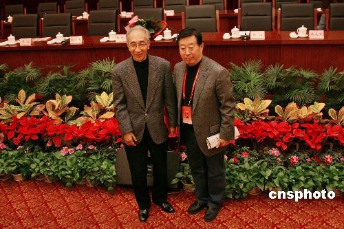 新当选的中国美协荣誉主席靳尚谊(左)和新当选的中国美协主席刘大为合影。中新社发 王保胜 摄