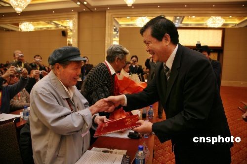中国文联党组副书记、副主席李牧给新当选的中国美协顾问刘文西颁发聘书。