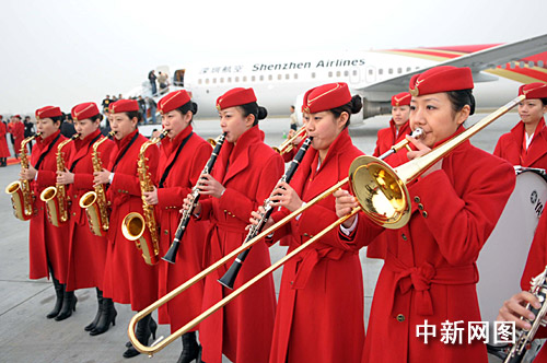 深航女子军乐队奏曲欢送台湾旅客登机。